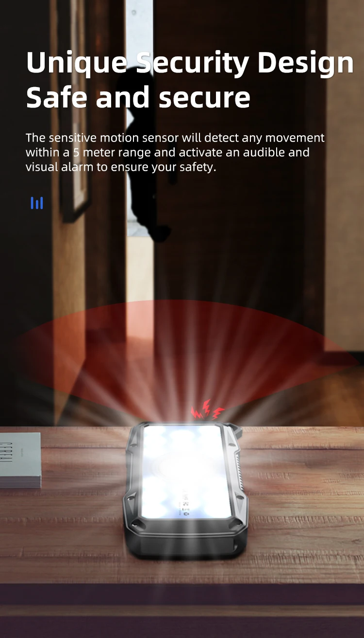 4. unique security design, sensitive motion sensor detects any movement within the range of 5 meters, start the sound and light alarm to ensure your safety.