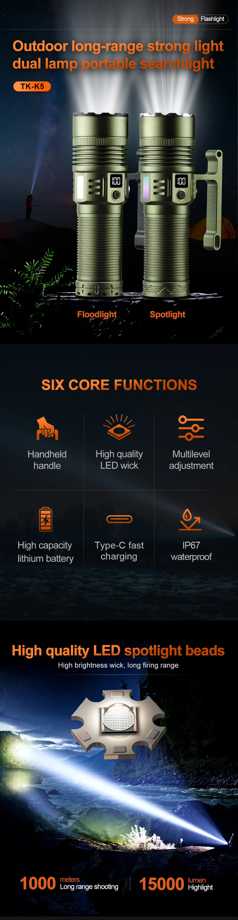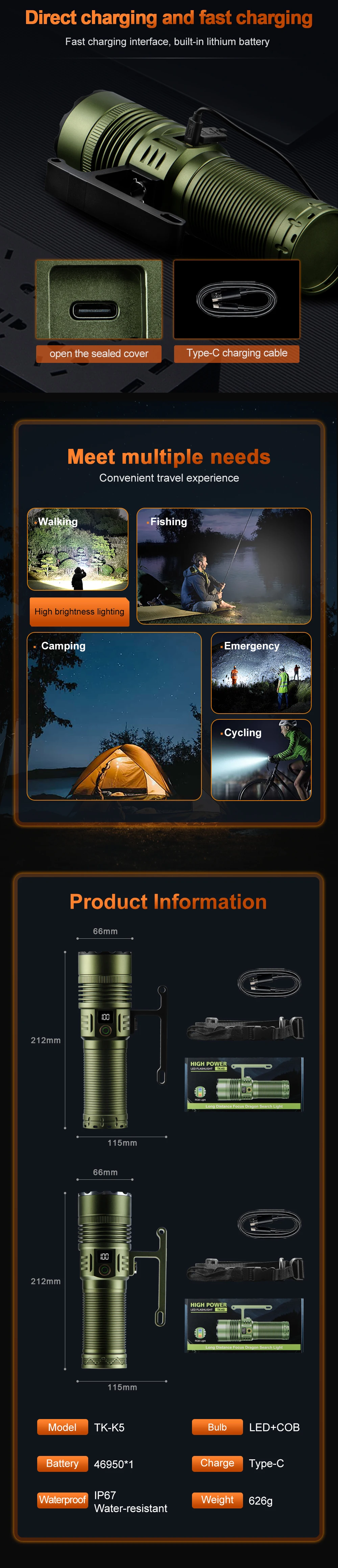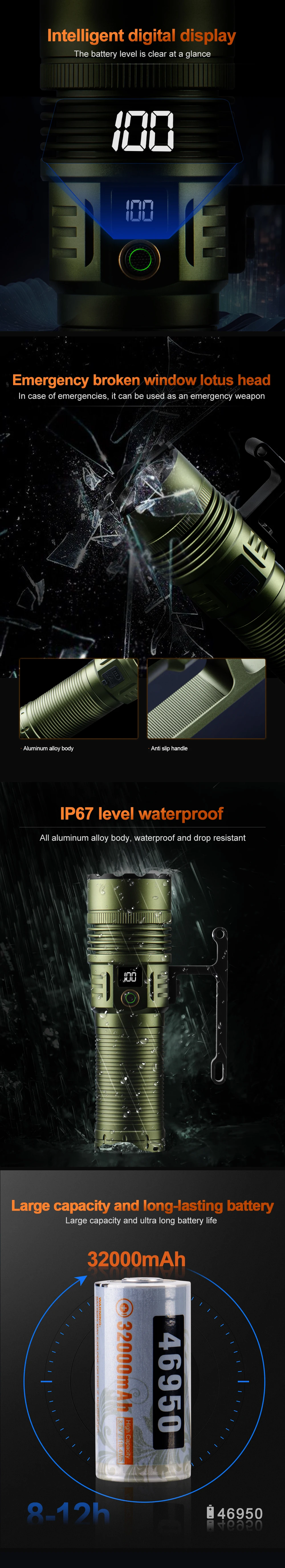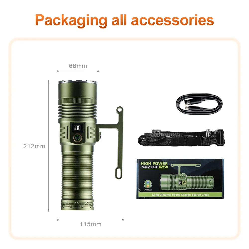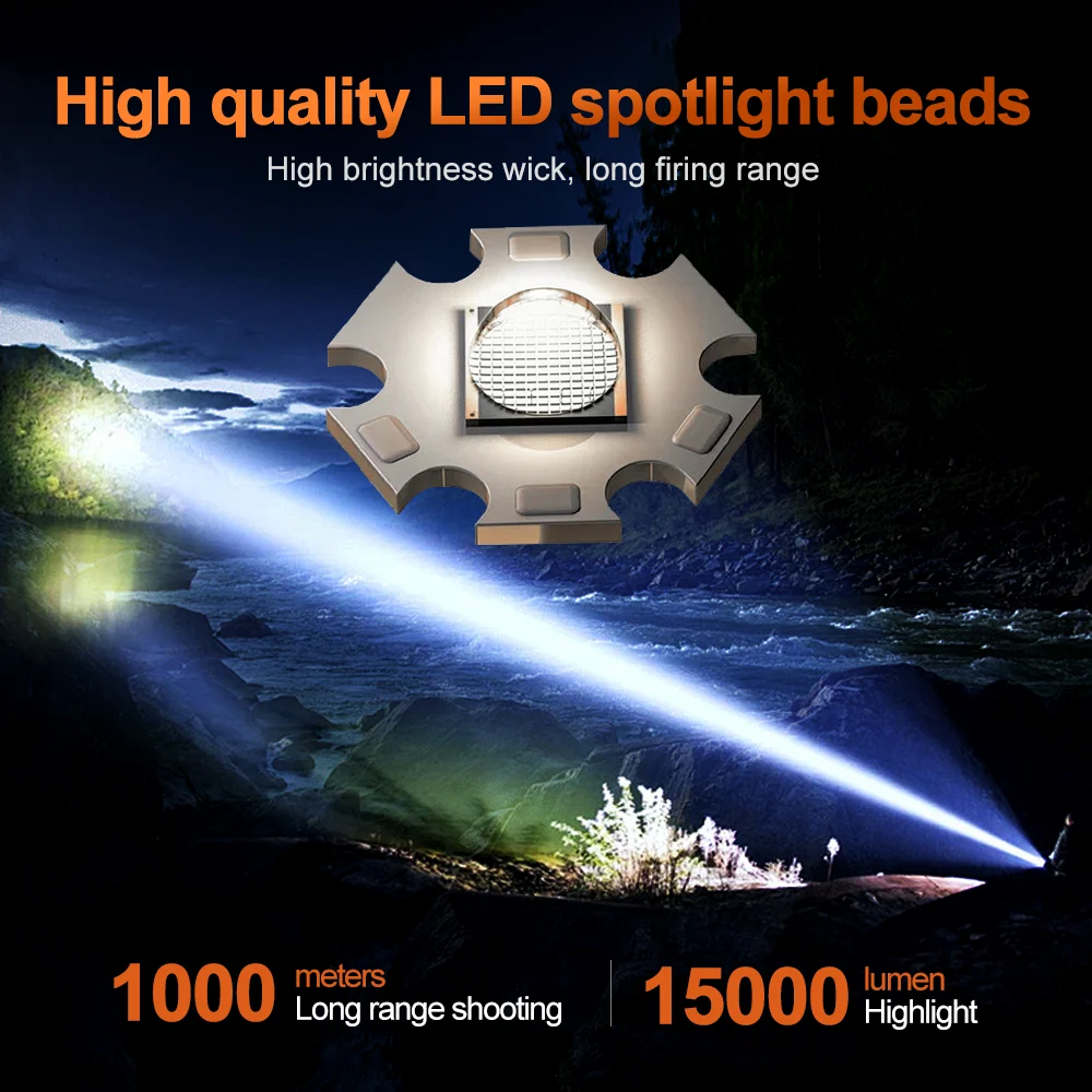 Introducing the ultimate outdoor camping flashlight that combines performance, durability, and style. With a powerful output of 15,000 lumens, this flashlight ensures maximum brightness to guide your path, whether you’re hiking, camping, or exploring. Designed for efficiency, it offers unparalleled illumination even in the darkest conditions, making it your go-to choice for night-time adventures.