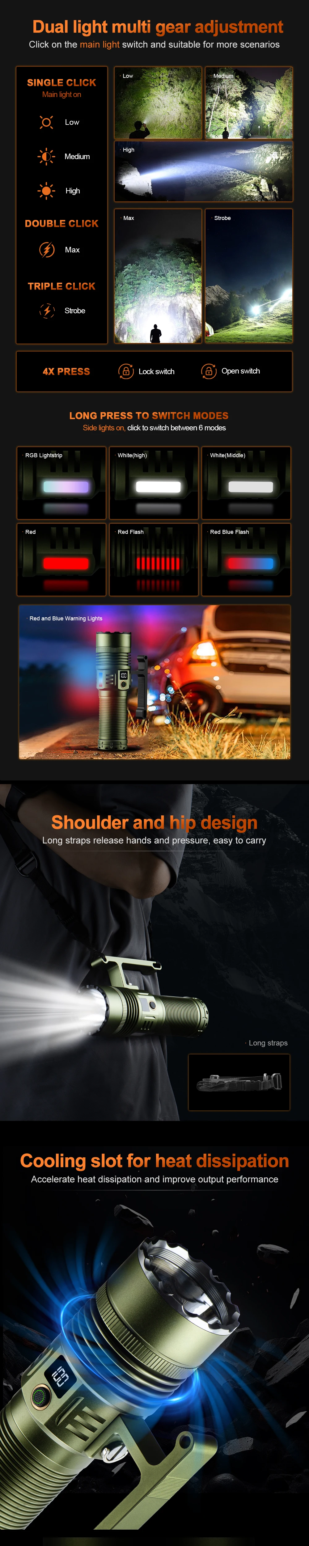 Crafted with a robust aluminum body, this flashlight boasts superior durability to withstand tough outdoor conditions. Its lightweight design ensures portability without compromising on sturdiness. Additionally, the RGB side lamp adds a layer of versatility, offering customizable color options for signaling, ambiance lighting, or enhancing visibility in unique scenarios. Whether you need focused, bright lighting or softer ambiance, this flashlight delivers.